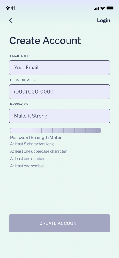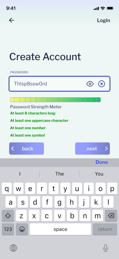 Instead of tapping from input to input, you are able to use the next and back buttons to navigate. In the previous design, the inputs would transition to their active state and slide into position, above the keyboard. This allowed the user to see all the information required and easily navigate using “next” and “back” buttons instead of scrolling.