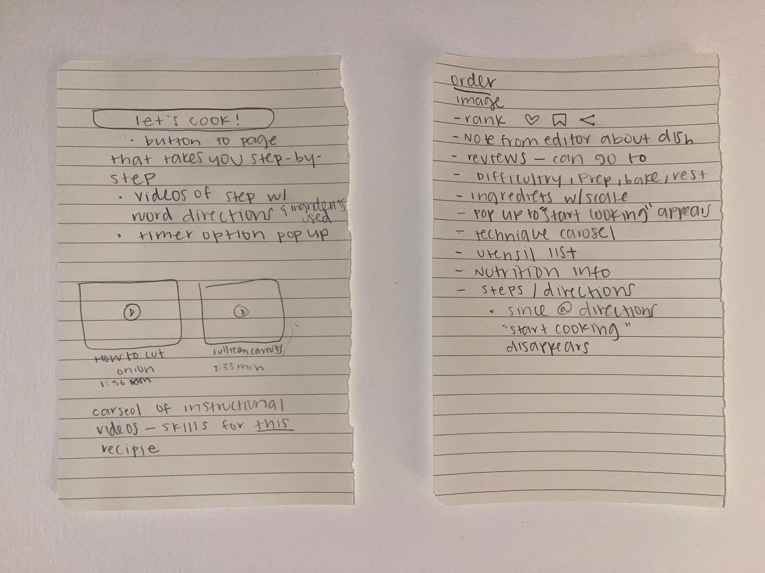 Sketching out the step-by-step cooking feature, the layout, and navigation of ingredients, directions, timers, etc.